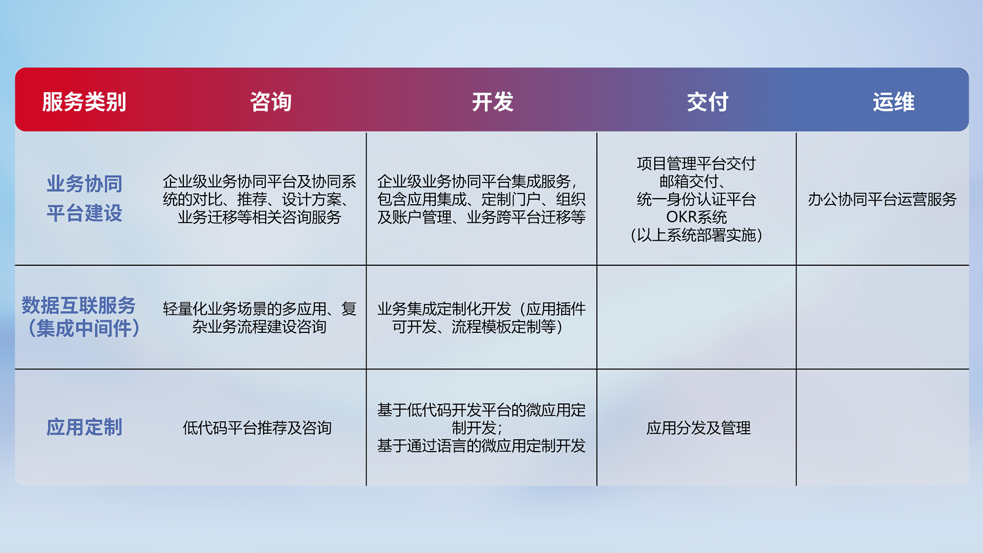 针对钉钉、、企微、、、、IDaas等平台级产品提供产品的规划、、、方案、、、交付、、定制化开发等服务,,,,实现如统一协同办公、、、智能客户服务、、混合会议管理、、、、智能数据查询、、等业务场景,,,,实现数字化转型。。。。